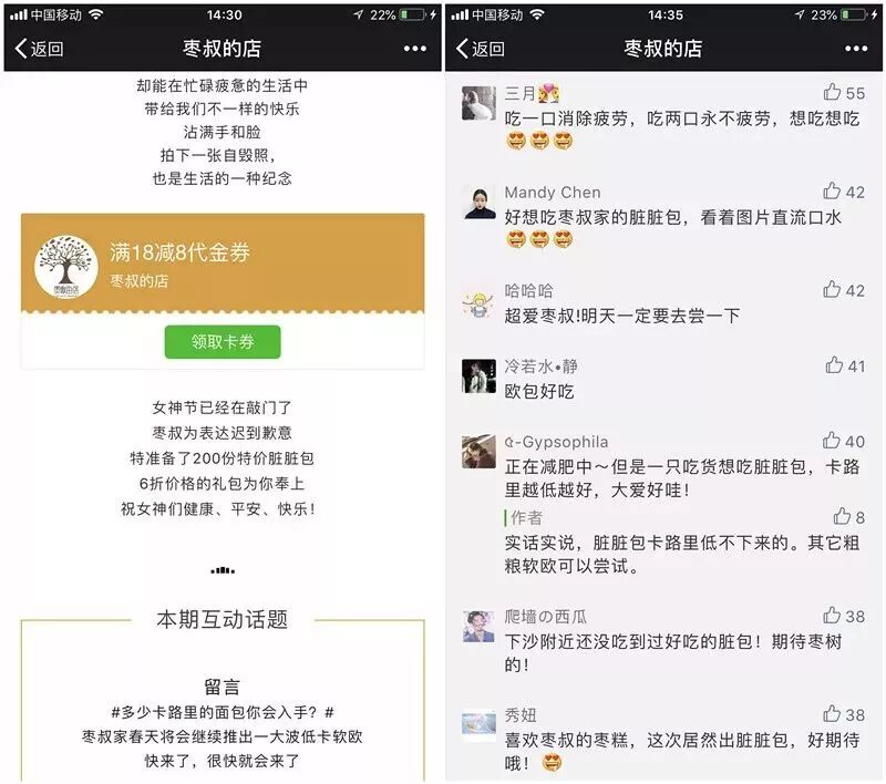 枣叔和他的团队不仅研发烘焙产品很在行,玩起营销也很6~品牌定期会在微信端发起各种活动,有关于节日的、热点的、新品的、情怀的……每一次活动的互动性都很强,无论是插件营销的领券核销数还是留言点赞,总能激起粉丝们的热情。