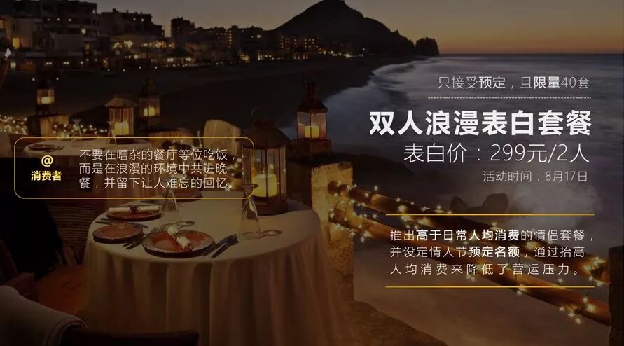 多数餐厅在策划情人节活动的时候,都会进行门店环境布置,通过音乐、摆件、灯光、海报等多种形式,为消费者营造浪漫的氛围。但,餐厅仅仅穿上情人节的“外衣”怎么够?占据情人节营销战略高度的某些西餐厅,往往不会选择同质化竞争。通常,此类餐厅会推出高于日常人均消费的情侣套餐,并设定情人节预定名额,通过抬高人均消费来降低营运压力。