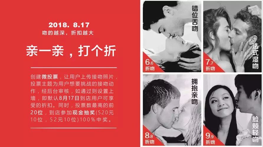 中国人个性比较含蓄,借着节日互诉衷情,因而情人节具有缠绵悱恻的情调,是很多年轻情侣光明正大“秀恩爱”的黄道吉日。餐厅可以利用“微投票”举行抽奖活动——“吻得越深,折扣越大”,如此“撒狗粮”的主题必定能吸引不少情侣的眼球。