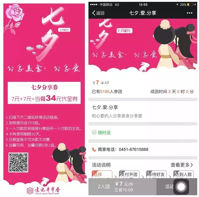 营销案例:“袁记串串香”于2017年8月发起七夕拼团活动:7元+7元=34元代金券。“捆绑式”的互动营销,不仅迎合七夕主题,更侧重让粉丝可以分享情感,成功吸引5195人参团,新增约13500名粉丝。
