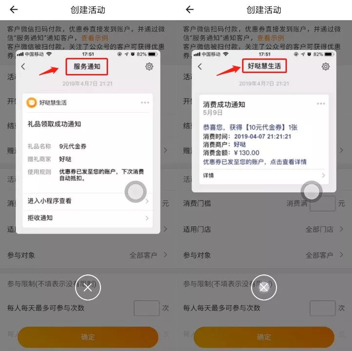 创建完成的支付后赠券会在微信支付完成后的微信“服务通知”和“好哒慧生活”公众号进行展示