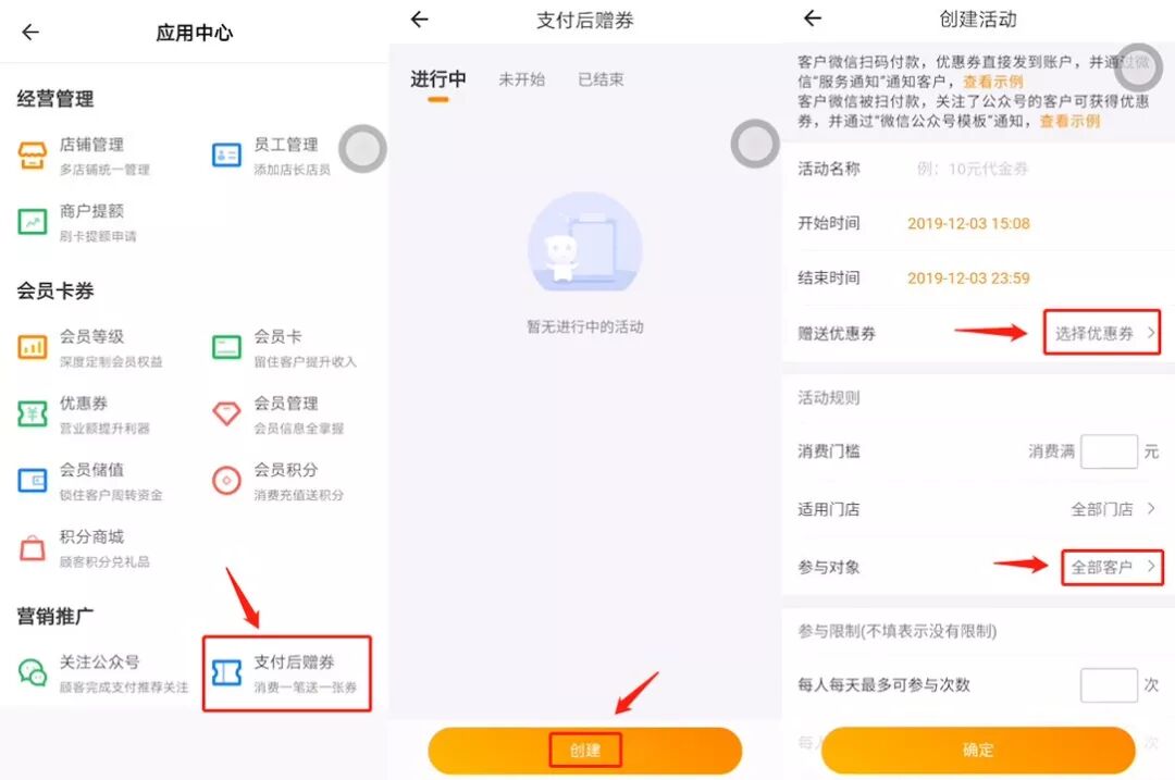【注意】“赠送优惠券”是在已创建的券中进行选择,“参与对象”可根据活动目的进行不同的选择。